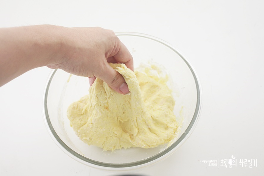 이렇게 살짝 반죽을 잡아 올리면 발효가 돼서 부드럽다고 할까요? 그렇다고 오랫동안 발효를 하면 쉰 냄새가 날 수 있으니 대략~20분 정도는 발효가 되게 두는 것도 좋을 것 같아요.