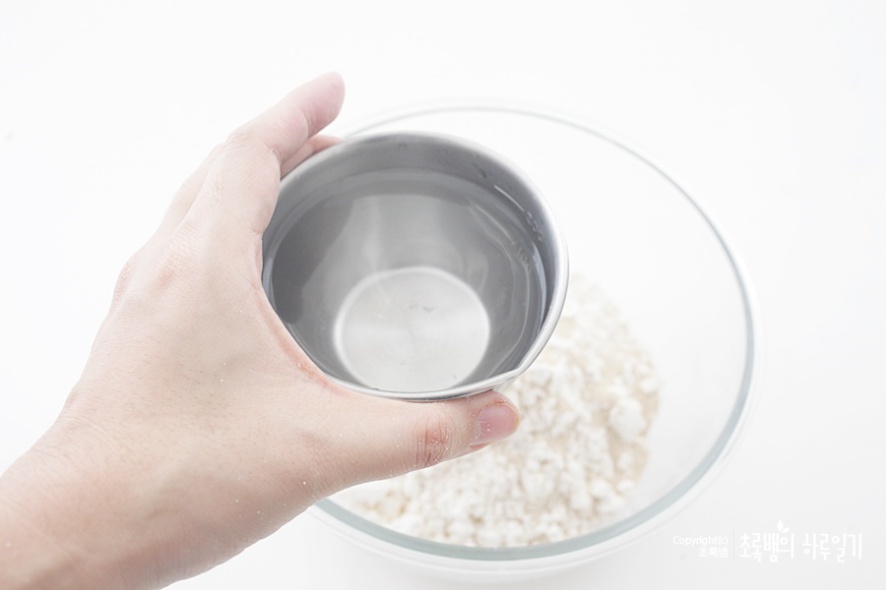 40~50도의 물 180ml를 넣습니다 이스트를 넣기 때문에 아무래도 발효가 되기 위해 미지근한 물을 넣는데요. 차가운 물을 넣으면 아무래도 발효가 되지 않기 때문에 미지근한 물을 넣는 것이 중요해요.
