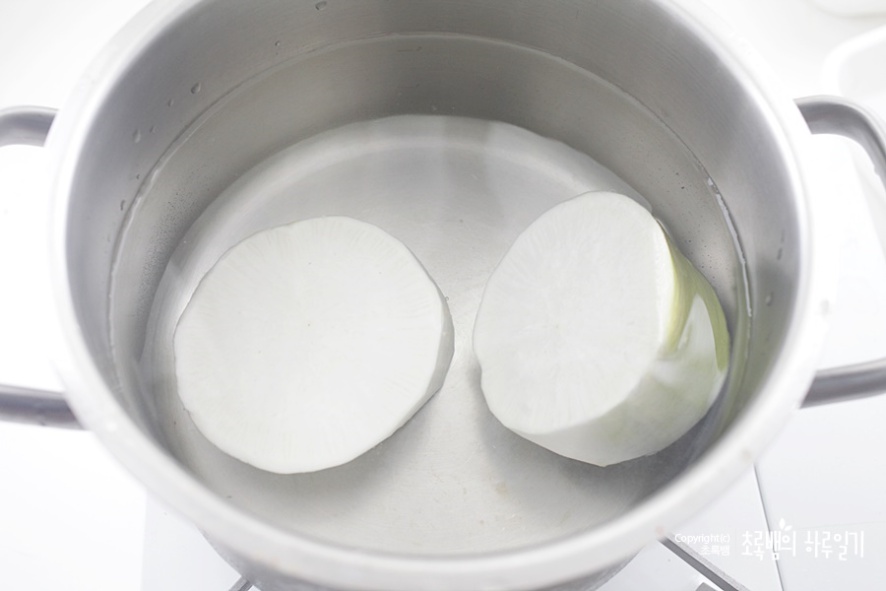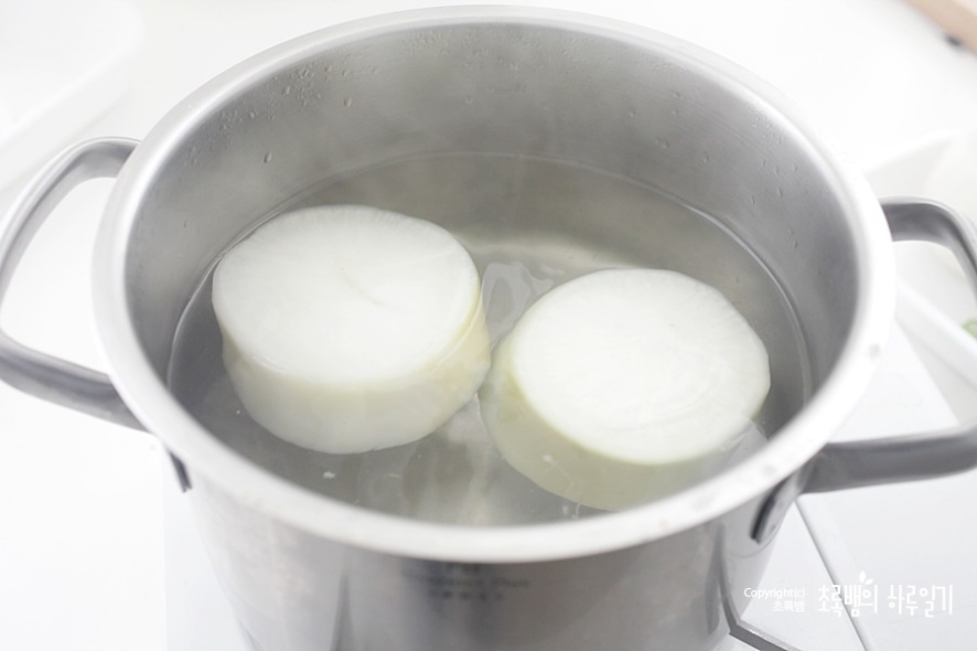 물은 3리터 정도 넉넉하게 넣어 준 후 무를 넣고 무가 익을 때까지 육수를 내줍니다. 멸치육수를 내면 잘못하면 멸치 비린내가 날 수 있는데 무를 넣으면 깔끔해요.
