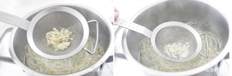 그냥 넣어도 되는데 저는 깔끔한 맛을 위해 이렇게 마늘을 채반에 넣고 30초~1분 정도 담가줬어요.