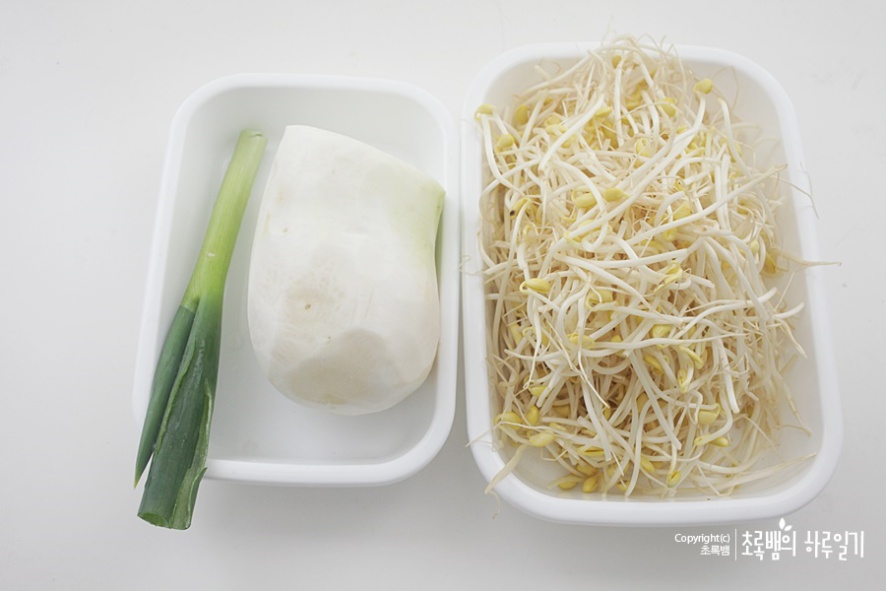 재료 : 콩나물 340g, 대파 1/2대, 다진 마늘 1큰술, 무 약간, 소금