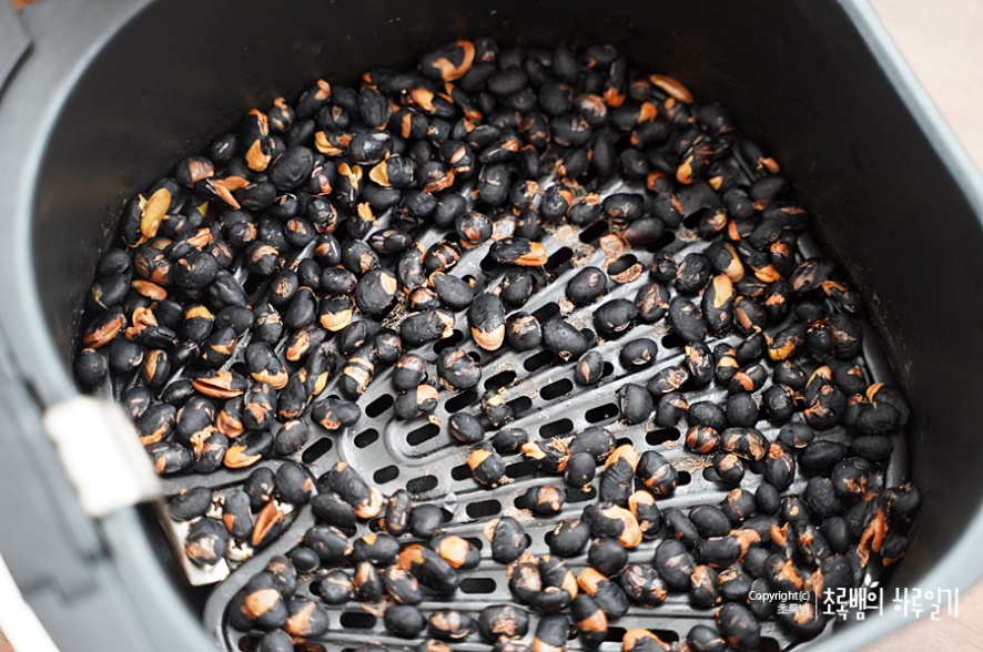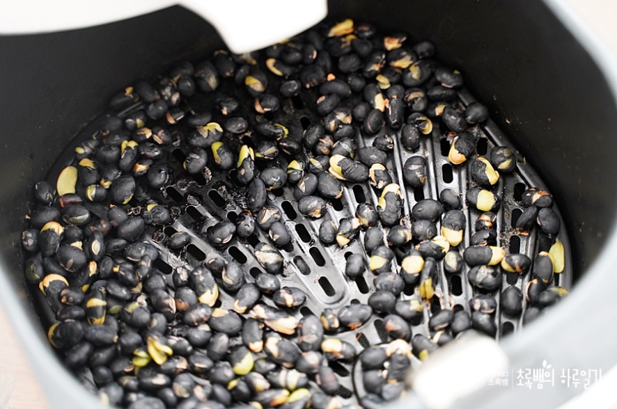 불어나니 콩이 2배가 되어서 2번에 나눠서 에어프라이어 검은콩 볶기를 했어요. 콩은 겹치지 않게 넓게 에어프라이어에 펴서 줍니다.