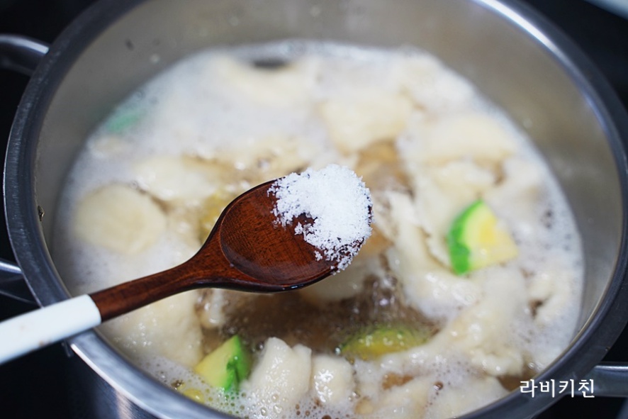 가장 먼저 감자를 넣고 익혀주세요. 감자를 넣고 5분 이상 지나면 아까 만들어둔 수제비 반죽을 넣어야죠.